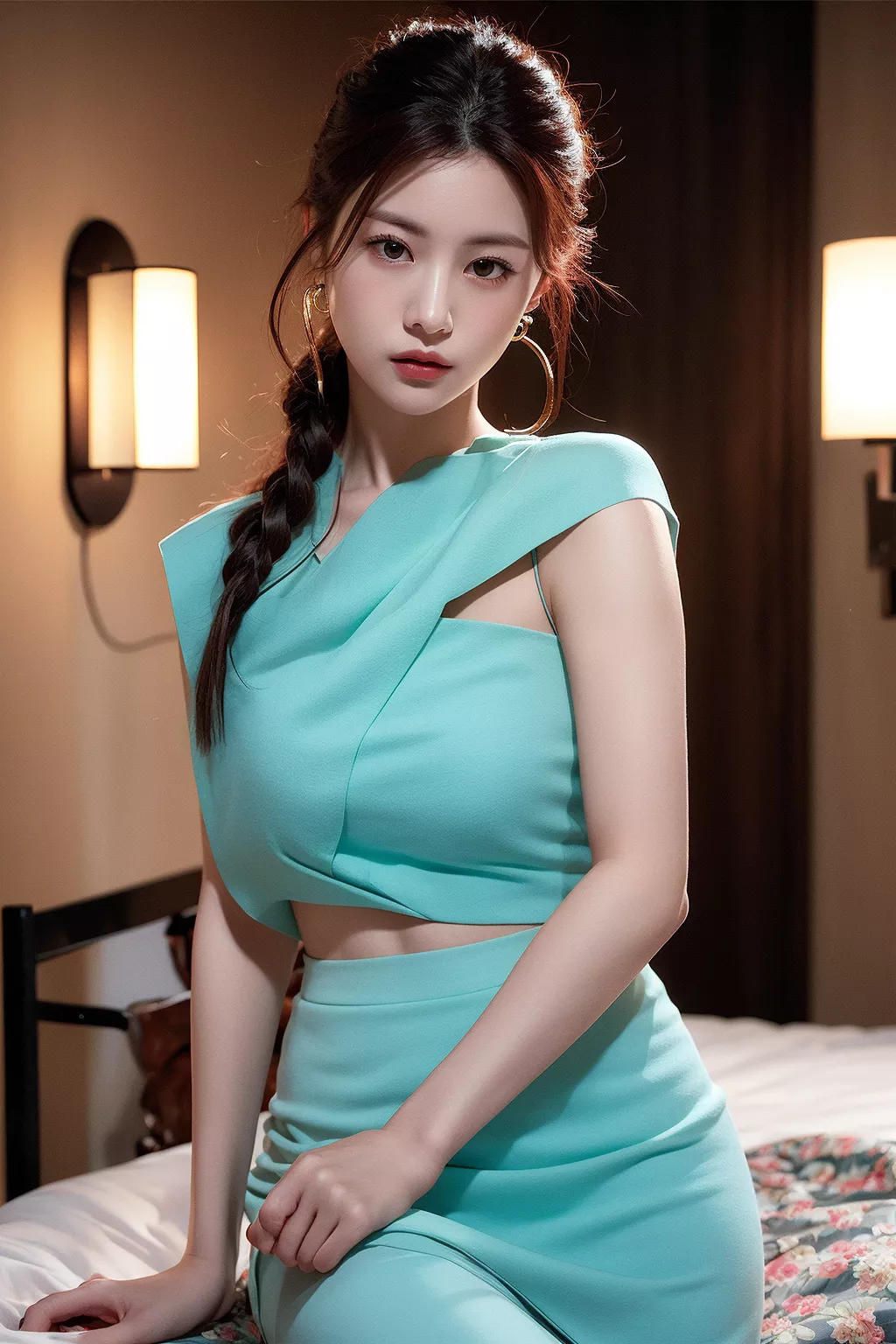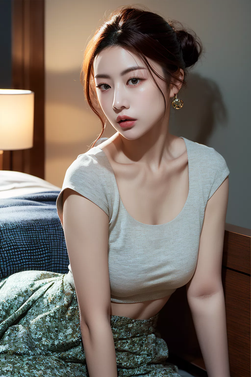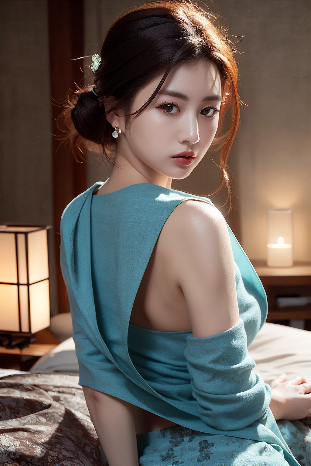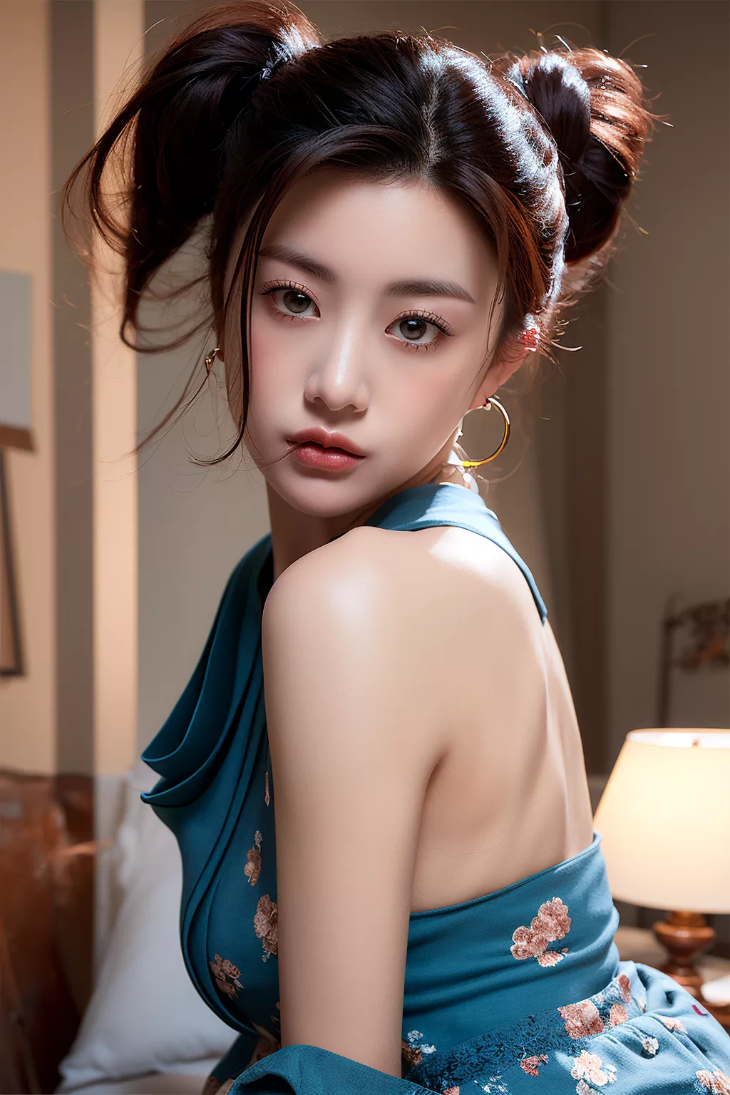 Best quality, masterpiece, ultra high res, (photorealistic:1.4), 1girl, in the dark, deep shadow, low key, (photorealistic:1.4), slim body, undone hair, Character, bed, blue floral skirt, green shawl, double bun hairstyle, earrings, wooden headboard, bedside lamp,japanese street alley, dynamic pose
