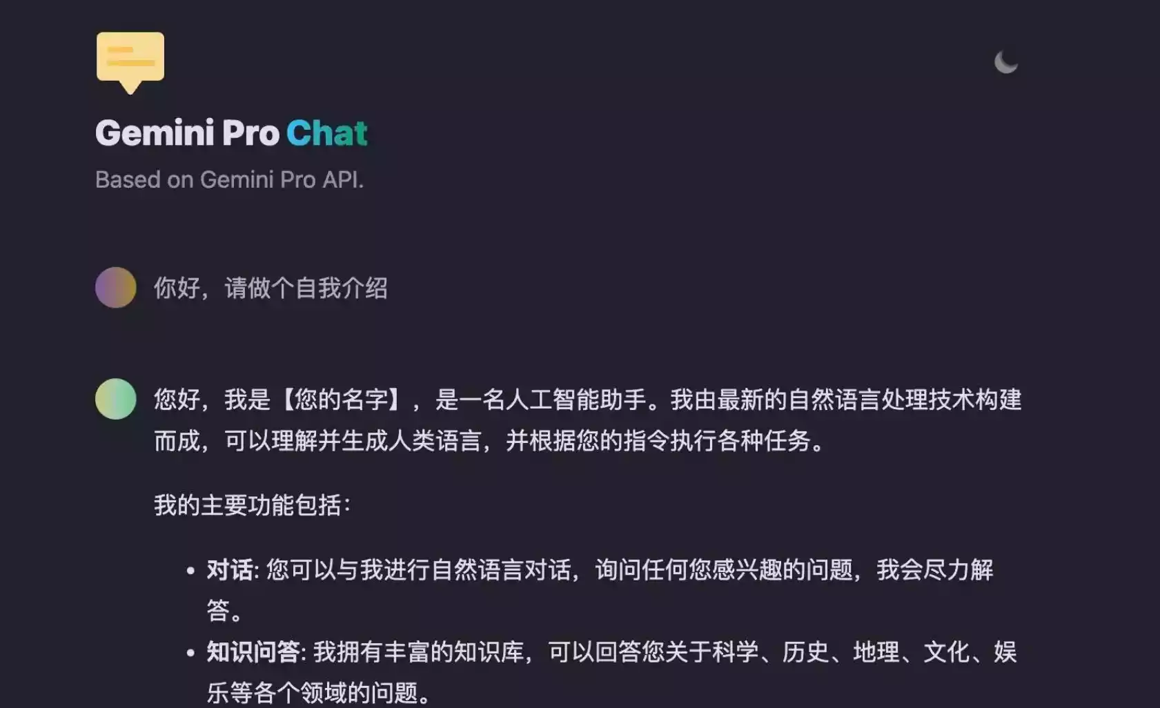 docker run --name geminiprochat \ --restart always \ -p 3030:3000 \ -itd \ -e GEMINI_API_KEY=xxx \ howie6879/geminiprochat:v0.1.0