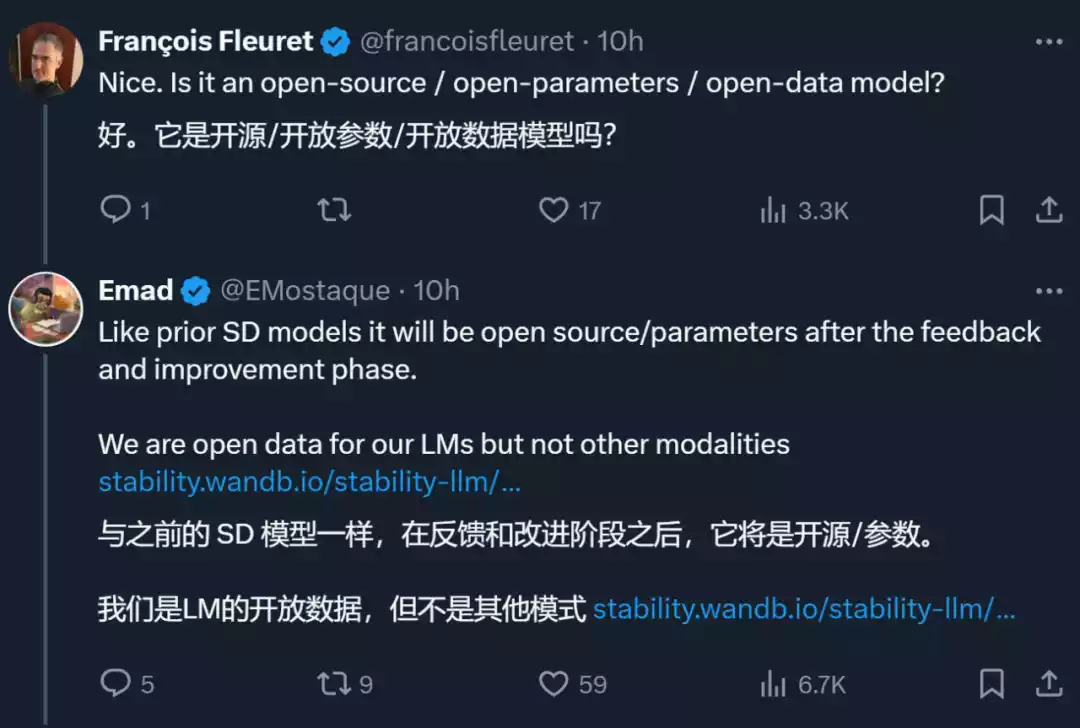 公司首席执行官 Emad Mostaque 在 X 平台的帖子中提到,在得到反馈并进行改进后,他们会把该模型开源