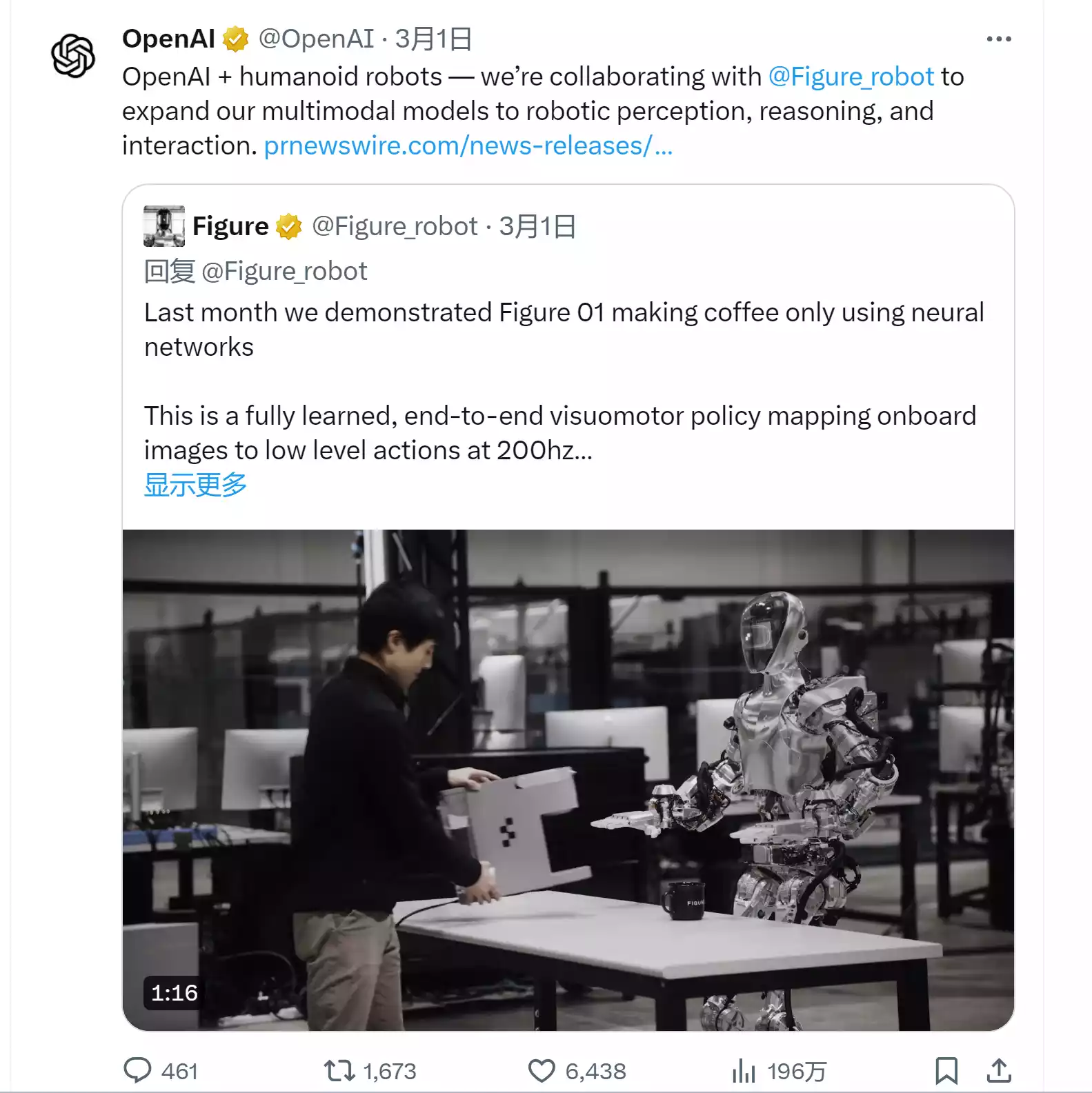 OpenAI副总裁Peter Welinder表示:“我们看到了与Figure合作的可能性,共同探索人形机器人在高性能多模态模型驱动下能够实现目标的方式。”他对Figure的进展感到震惊,并期待共同努力,开辟机器人在日常生活中提供帮助的新可能性。