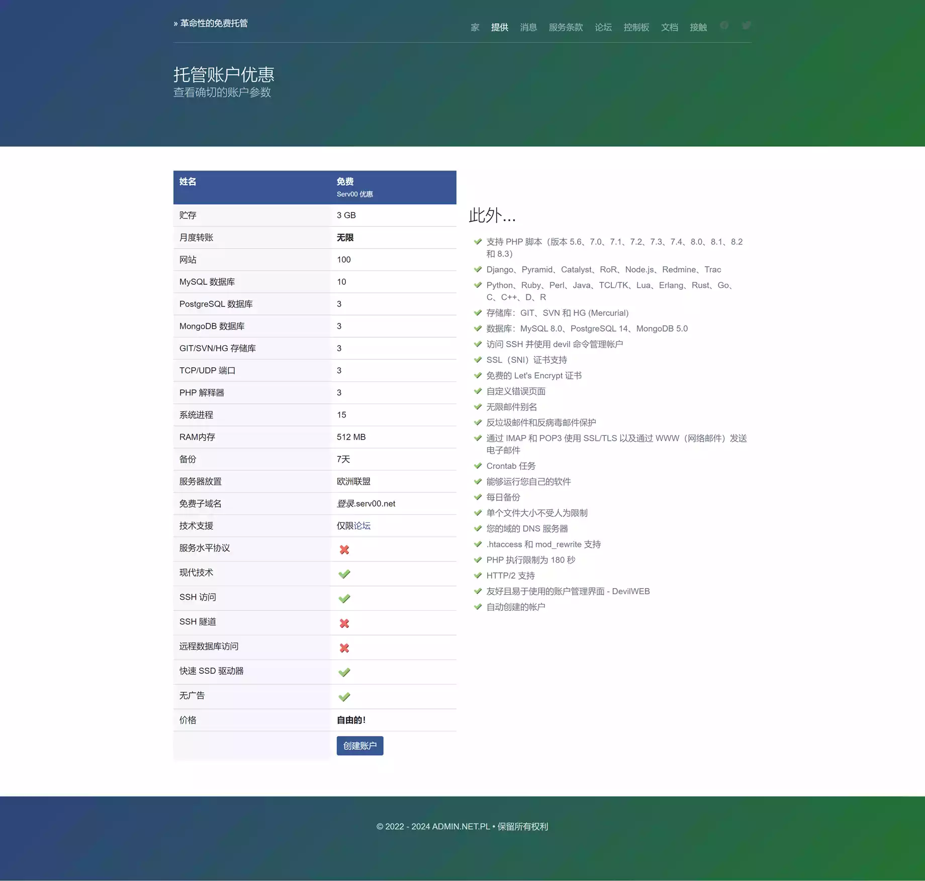 Serv00 是一家波兰的免费VPS提供商,成立于2008年,致力于 Web 应用托管市场和 UNIX/Linux 服务器管理