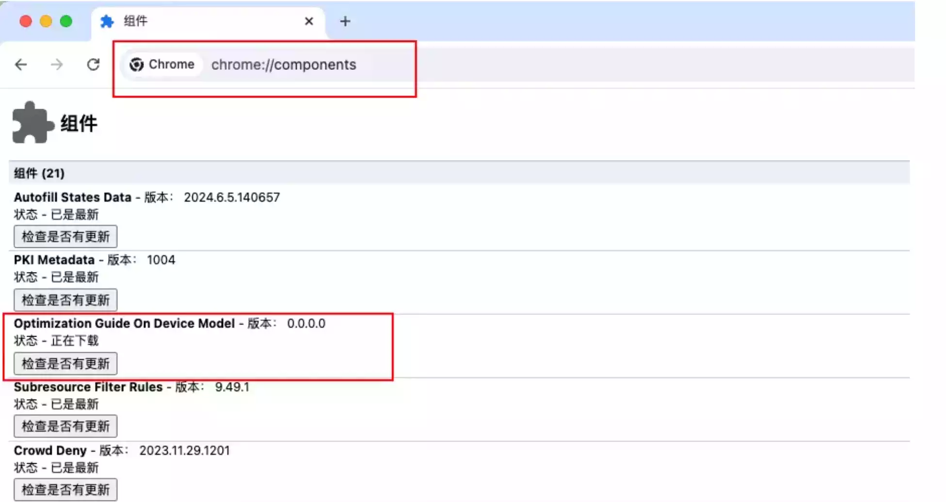 找到Optimization Guide On Device Model,按下方的检查更新,如果你没看到这选项,可以等个几分钟后再打开这页面检查。还是没看到的话,可以尝试把浏览器语言改成English US: