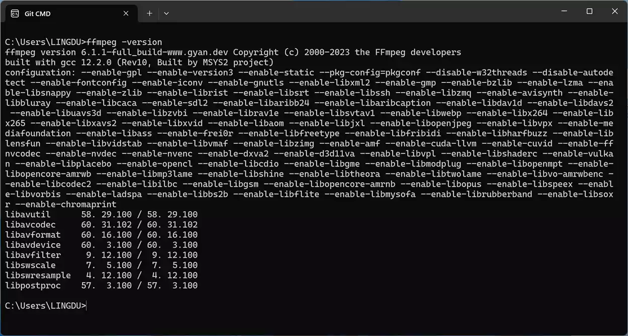 在CMD命令终端下,输入: ffmpeg -version,有类似如下版本信息输出,就说明配置成功了!