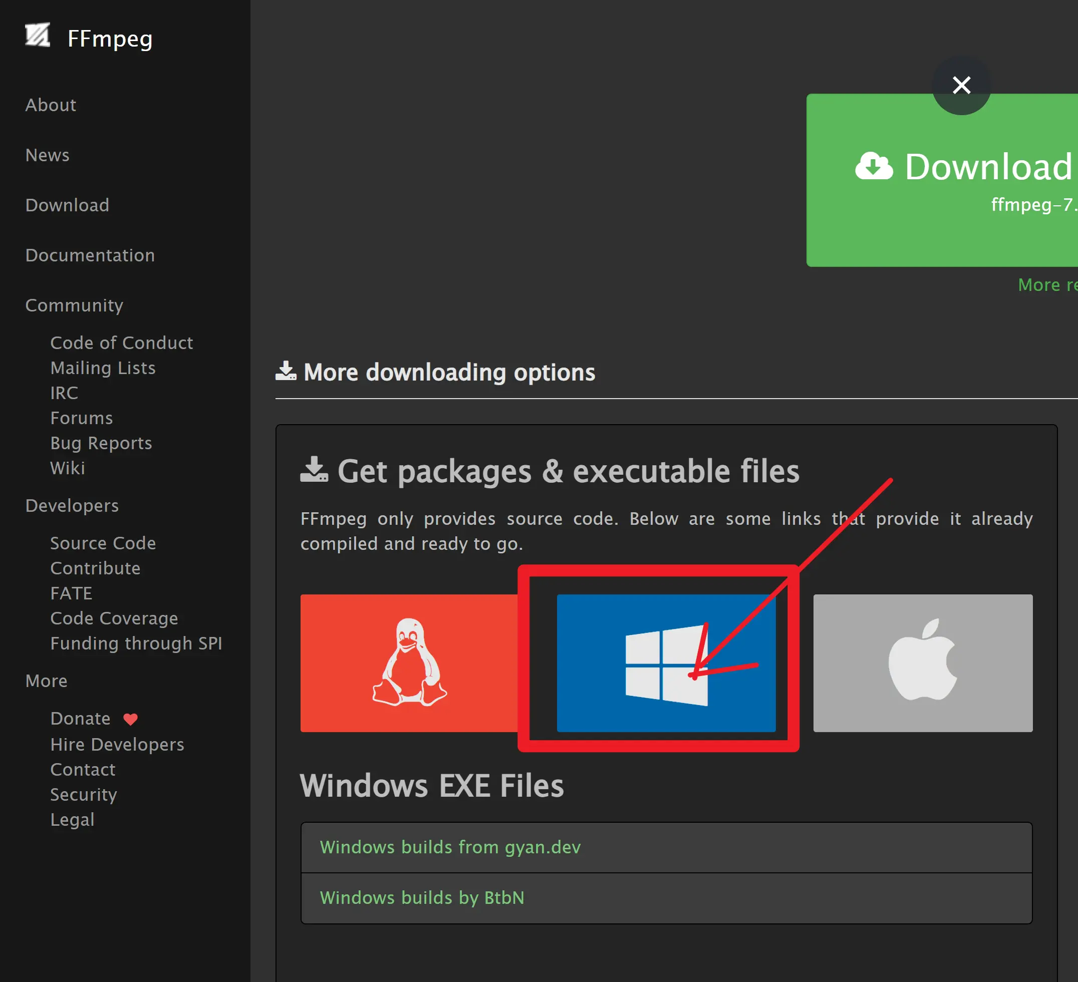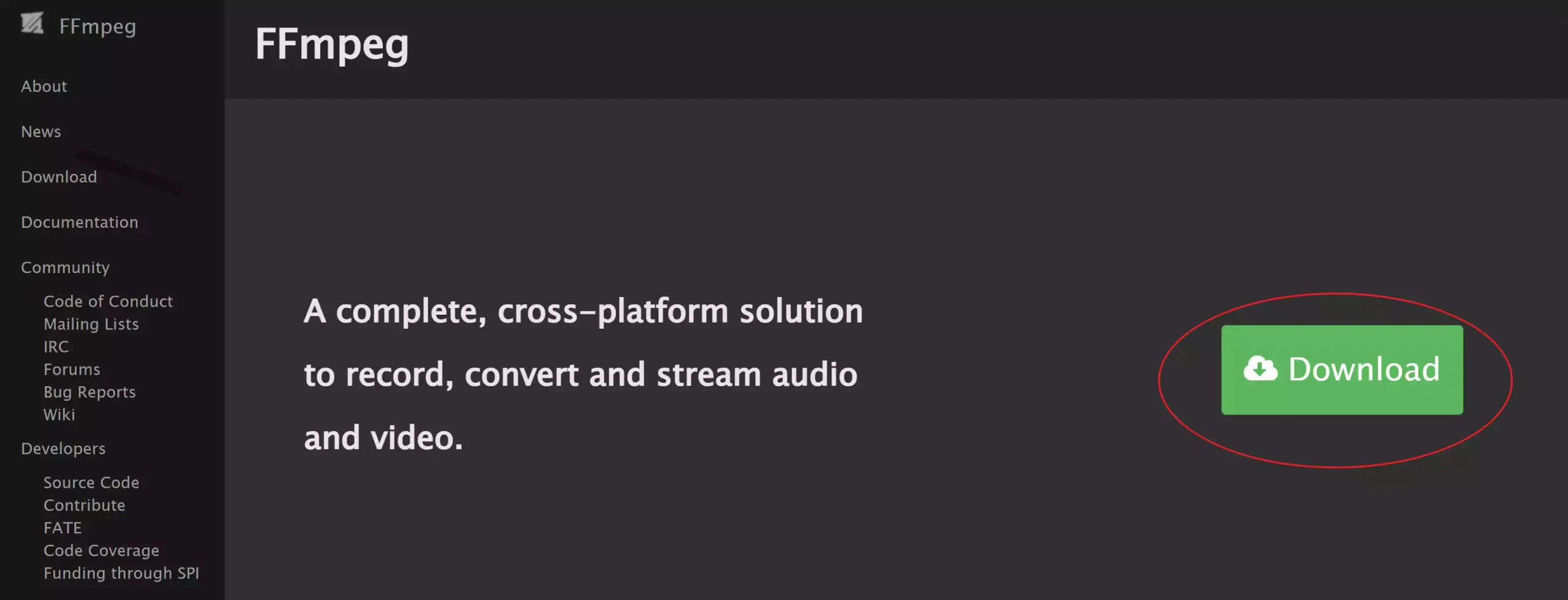 访问 FFmpeg的官网链接:https://ffmpeg.org ,然后点击右侧的下载按钮。