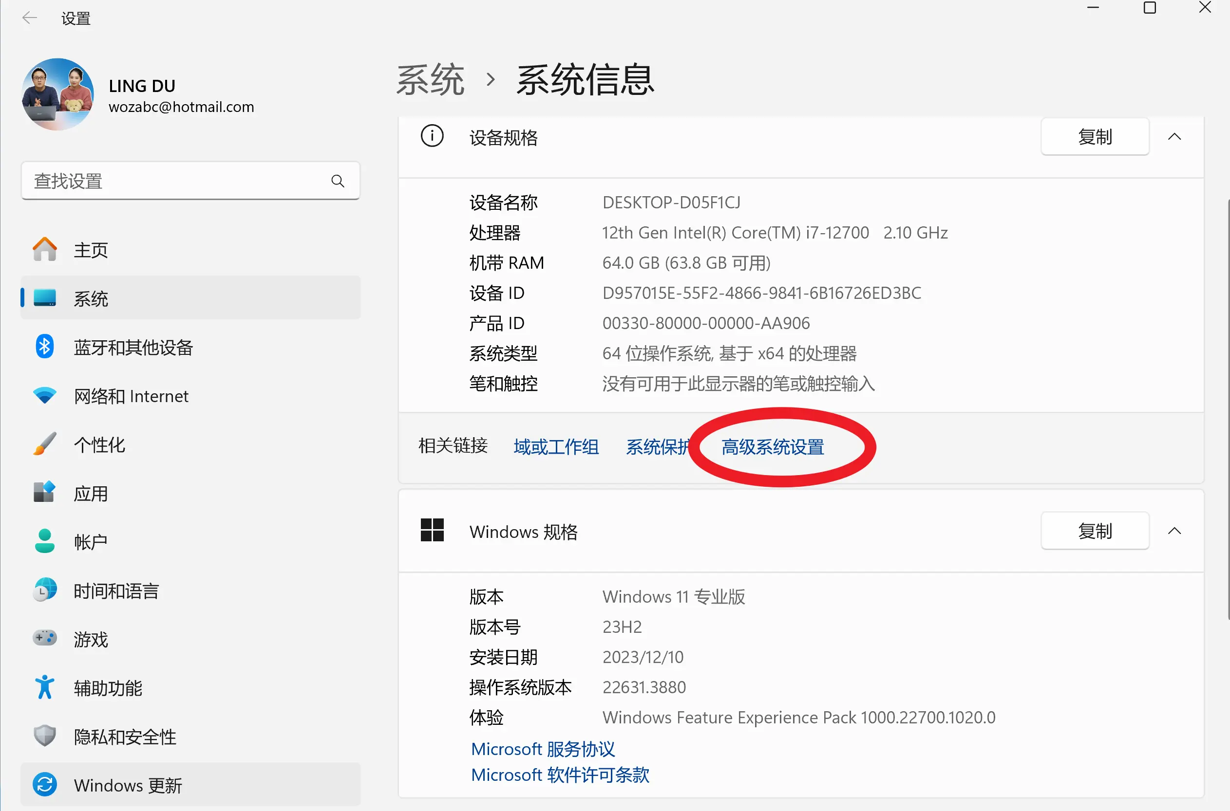 3、打开后点击右侧的高级系统设置