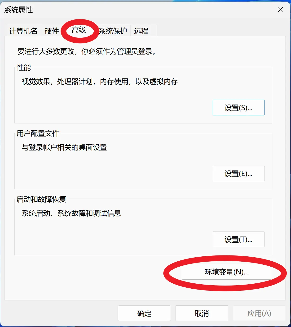 接着依次点击 高级 -> 环境变量: