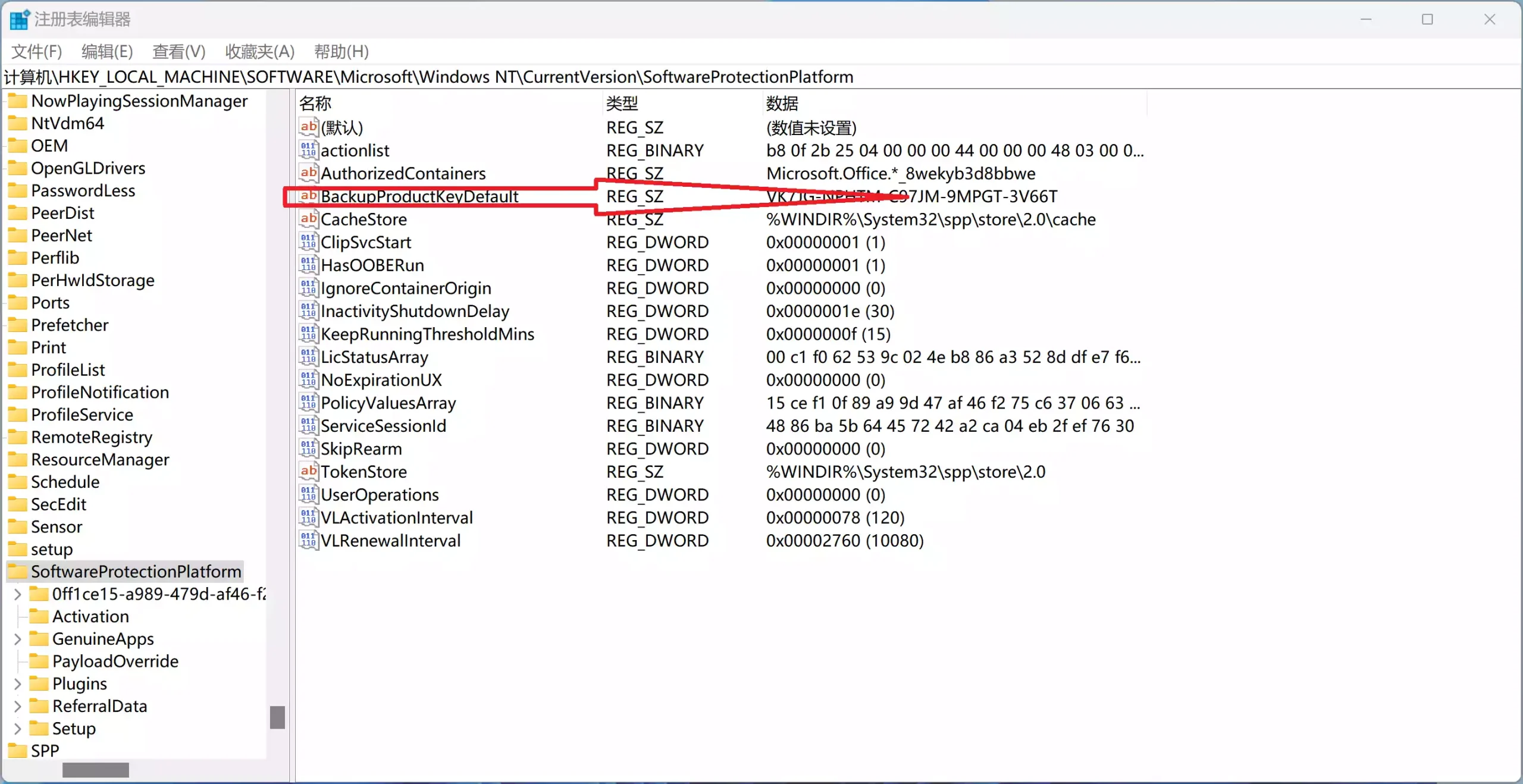 找到 BackupProductKeyDefault,在其后面就能找到你的激活密钥